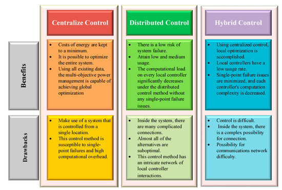 Most hybrid systems utilize distributed or hybrid control since these types of control are efficient in decentralizing control, minimizing system error, and allowing for the use of multiple kinds of control in a single hybrid system. The only limitation of these kinds of control is the ambiguity of the connection, along with processing codes. On the other hand, when a centralizing method of control is utilized in a smaller-scale HRES it shows excellent efficiency and improved performance, along with simplicity in construction. In addition, the cost of centralized control is advantageous when compared to distributed control or hybrid control. Figure 11 compares the most significant control types.