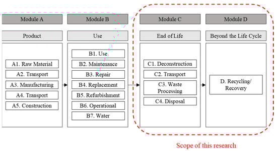 As mentioned previously, the objective is to compare and quantify the environmental impacts of typical steel roofing and wall cladding used in New Zealand, as well as to quantify the importance of effective recycling. The scope of the analysis is limited to modules C to D, as shown in Figure 3, of the LCA framework to BS EN 15978 [].