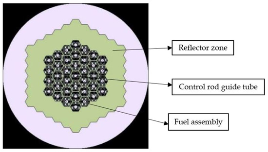 According to the engineering requirements for the selection and optimization of fuel for small lead-based reactors, this paper gives the main design parameters of the 60 MWt lead-cooled fast reactor (Table 1), referring to the EU-funded LEADER (Lead-cooled European advanced demonstration reactor) [26] and the Belgian closed hexagonal fuel assemblies [27]. The core is made of 37 fuel assemblies and 54 reflector assemblies, each of which is a hexagonal fuel assembly (control rod guide tubes are reserved in the middle). Each assembly contains 217 rod positions, of which 19 rod positions are reserved for control rod guide tubes. A total of 19 rod positions are reserved in the middle of each assembly, and they can be adjusted into different types of control assemblies according to different requirements, so that the initial excess reactivity of the core can be controlled. The active core height is 90 cm, and the equivalent core diameter is 107 cm. The x–y cross-sections of the assembly and the core are shown in Figure 1 and Figure 2. The fuel rod is composed of fuel pellets, air gaps, and cladding. Sufficient air gaps are left around the fuel rods to accommodate the released fission gas. The cladding is made of stainless steel. Using BeO as the reflector material can effectively reduce the leakage of neutrons and thus prolong the core life.