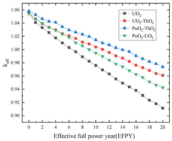 In addition, the fuel burn-up characteristics of the core under different energy spectrum conditions were quantitatively analyzed for each fuel. From Table 3, it can be seen that for UO2 fuel, the core keff varies little with the energy spectrum and the life of the reactor core does not change significantly. For breeding fuel PuO2-ThO2, the keff changes greatly with the energy spectrum and the core life is more significantly affected by the energy spectrum when the core is loaded with PuO2-ThO2 fuel.