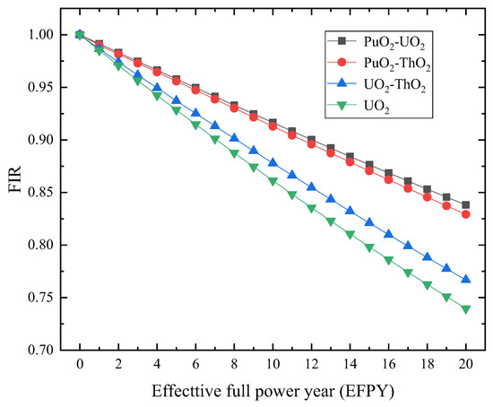 As shown in Figure 4, the order of FIR with core operation time for the four fuels analyzed is PuO2-UO2 > PuO2-ThO2 > UO2-ThO2 > UO2.