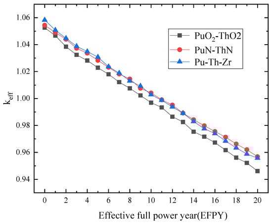 Small reactors have many applications, such as military nuclear power, seawater desalination, and power supply in remote areas, etc. [22,23,24]. When the size of the reactor is reduced to a certain extent, it can also be used on a large vehicle or ship to achieve mobility. The most typical of these are nuclear power reactors on nuclear-powered aircraft carriers and nuclear-powered submarines, and the sustained power provided by nuclear energy can increase their ability to continue navigation by orders of magnitude. However, in order to ensure nonproliferation and nuclear security, many small reactor concepts require no on-site refueling strategy and adopt cradle-to-grave fuel services [25]. In order to achieve safety while maximizing economics, we have to consider how to prolong the life of small reactors by as much as possible. Thus, how to extend the life of small reactors is a practical problem. It is of great engineering significance to conduct research in this respect. Based on this problem, this paper takes the core fuel as the research point, and compares and analyzes the burn-up, breeding characteristics, and physical parameters of U-Pu and Th-U cycle fuel, and oxide, nitride, and metal fuel. Finally, a fuel type that meets the requirements of long life and miniaturization is selected, which can provide some reference for the design of long-life small lead-based reactors.