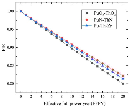 The FIR is based on the densities of the fission nuclides U-233, U-235, Pu-239, and Pu-241. Since U-233 is more prone to fission than Pu-239, this is why PuO2-ThO2 has better breeding performance than PuO2-UO2, but PuO2-UO2 has a larger FIR; however, for UO2-ThO2 and UO2 fuels, because U-233 is more prone to fission, the FIR of UO2 fuel is larger theoretically, but the FIR of UO2 fuel is smaller than the value of UO2-ThO2. The following are the two main reasons for this: (1) the driving performance of U-235 is weaker, so the probability of causing a fission reaction in the fuel is small and the consumption of U-233 becomes slow; (2) Th-232 has a stronger breeding performance than U-238, producing more fission nuclides. Hence, the FIR of UO2 fuel is smaller than the FIR of UO2-ThO2 fuel.