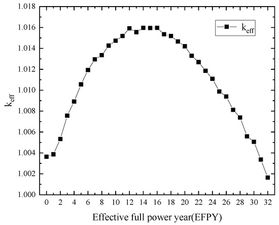 The calculation was carried out using OpenMC code developed by the Massachusetts Institute of Technology (MIT), based on the endfb7 database [28,29]. The OpenMC code is a continuous energy Monte Carlo reactor physical burn-up calculation code. The OpenMC code is exceptionally convenient in modeling and can perform burn-up calculations. Moreover, the format of the output results is very organized. For burn-up calculations, the burn step is set to 1 year. The high-temperature continuous point cross-section library was used in the calculation. The fuel, coolant, and cladding temperature were set to 1200 K, 600 K, and 900 K, respectively.