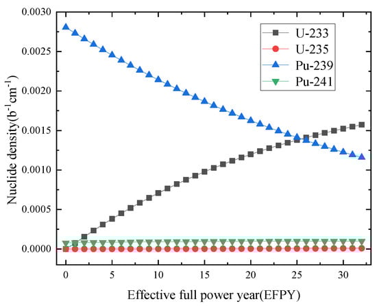 The fissile nuclides considered here are U-233, U-235, Pu-239, and Pu-241. First of all, it can be seen in Figure 9 that the Pu-239 nuclide will gradually decrease due to fission, and the stock of U-233 nuclide produced after Th-232 captures the neutron will continue to increase. At the same time, Pu-240 produces Pu-241 due to the capture of neutrons. Thus, the stock of Pu-241 nuclides increases slightly, but the overall number is minimal; the content of U-235 throughout the fuel burn-up process is very small, and the effect on the core excess reactivity is also small. In the previous 14 years, due to the high content of Th-232, the stock of U-233 nuclides increased rapidly, which gradually increased the core excess reactivity. Subsequently, due to the gradual decrease in the content of Th-232, the content of U-233 produced is far from able to make up for the consumption of fissile nuclides, so the core excess reactivity gradually decreases. However, throughout the burn-up process, the content of fissile nuclides gradually decreases relative to the content of the original breeding nuclides. Therefore, in Figure 8, it can be seen that the core excess reactivity gradually increases in the first 14 years, and then gradually decreases; in Figure 10, it can be seen that the stock of fissile nuclides in the reactor core decreased more slowly in the first 14 years, and the nuclide content in the reactor core decreased more rapidly after 14 years. Therefore, the problems reflected in Figure 8 and Figure 9 are consistent, so there is no conflict.