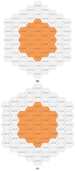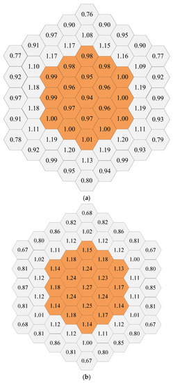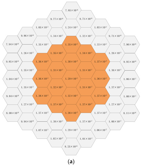 Based on the 60 MWt lead–bismuth reactor core scheme in Section 2, the preliminary design of the 120 MWt lead–bismuth reactor core scheme is carried out. The reactor core consists of 61 fuel assemblies, each of which is a hexagonal fuel assembly (with a control rod guide in the middle). Each assembly contains 217 rod positions, and the 19 rod positions in the center part of the assembly are reserved for control rod guide tubes. The overall structure and dimensions of the fuel assembly are consistent with the 60 MWt core scheme, but the height of the active zone is 150 cm and the equivalent diameter of the active zone of the core is 172.2 cm. The core layout is shown in Figure 7. The parameters of the inner and outer zone fuels are listed in Table 10.