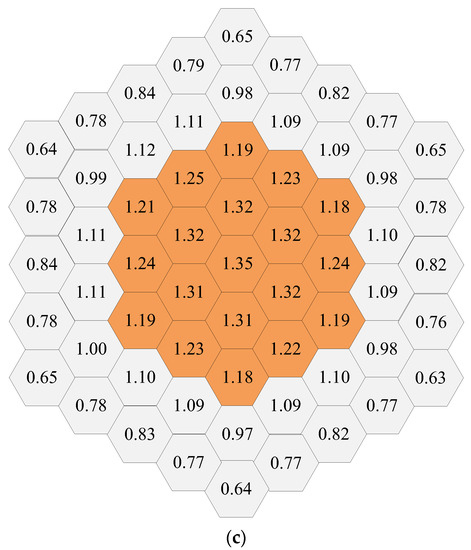 (a) Power distribution at BOC; (b) power distribution at MOC; and (c) power distribution at EOC.