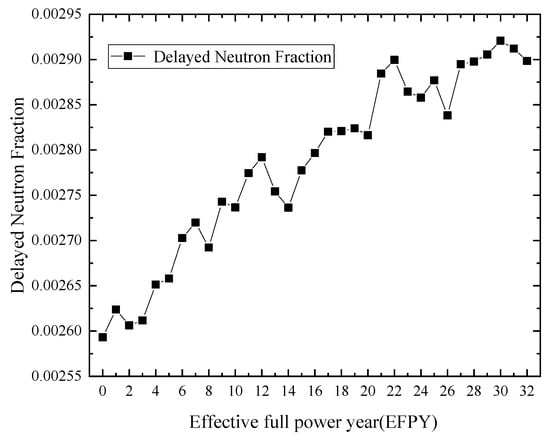 The average life of delayed neutrons is approximately 13 s, which is orders of magnitude longer than the average life of prompt neutrons. Delayed neutrons extend the average life of neutrons, thereby prolonging the period of the reactor and making it possible to control the reactor. Because delayed neutrons play an essential role in reactor safety and control, the fractions of the delayed neutrons of four fuels were compared. In Table 6, the fractions of delayed neutrons of four fuels are given. The results presented in Table 6 are obtained based on the burned fuel rather than fresh fuel, and EFPY (effective full power year) for the burned fuel is 20 years. By analyzing Table 6, it can be found that the fraction of delayed neutrons of PuO2-ThO2 fuel is small (less than 0.3%), so higher requirements are placed on reactivity control and the design of control rod systems.