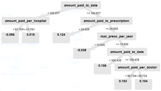 Presents the gradient boosted decision tree. Tree description. GBTM has 20 leaves, but here we display the final tree, which contains 20 leaves. amount_paid_to_date < 100.977; | amount_paid_per_hospital < 51.781: −0.096 {}; | amount_paid_per_hospital >= 51.781: 0.015 {}; amount_paid_to_date >= 100.977; | amount_paid_to_prescription < 24.629: 0.124 {}; | amount_paid_to_prescription >= 24.629; | | max_presc_per_year < 13.500: −0.038 {}; | | max_presc_per_year >= 13.500; | | | amount_paid_to_date < 106.439: 0.106 {}; | | | amount_paid_to_date >= 106.439; | | | | amount_paid_per_doctor < 56.734: 0.103 {}; | | | | amount_paid_per_doctor >= 56.734: 0.104 {}.