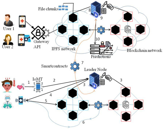 The proposed system’s operational flow: (1) The sensor data are securely sensed from user. (2) The IoMT device securely uploads the data to DDSS using gateways. (3) The data are stored on the IPFS network, and its metadata are published to the blockchain network. (4) Business logic-based alerts are derived from DDSS. (5 and 6) EHR is only accessible to authorised users. (7) Non-personal data are published to a cloud-based DDSS using smart contracts. (8 and 9) Data are cached and process for predictions. (10) Time-to-time statistics are projected.