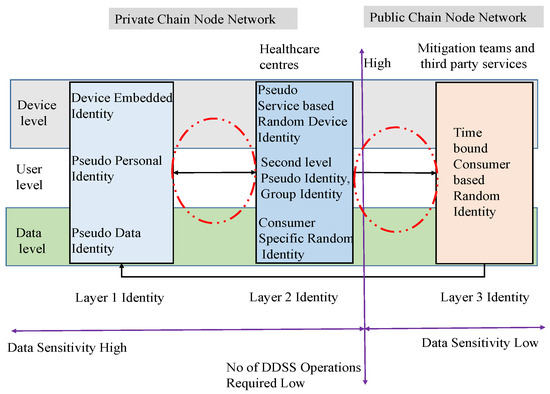 In order to maintain data privacy and security, we introduce DDRAC, which uses a three-layer identity management. The DDRAC mainly considers two instances: the first one is the sensitivity of information and the second one is users authorization. A simplified layered view of identity management is shown in Figure 4. After data have been generated, they are encrypted with the leader’s public key and transmitted to the respective leader. In addition, leaders are responsible for maintaining the local cache in Layer Two in order to increase the system’s throughput. In Layer Two, the edge computer prepares non-personal information for Layer Three. All transmissions between the second and third layers are encrypted using access codes. Edge computing on the second layer is responsible for DDRAC and DDSS maintenance.