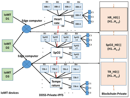 An abstract view of data-flow from the IoMT devices to DDSS-EHR. The edge computing devices perform DDSS operations. DDSS-IPFS meta-information is written to blockchain.