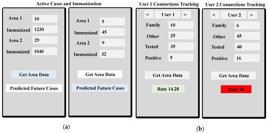 CoviBlock assisting in 3T operations. (a) Area-wise information from 3T on DDSS and number of possible cases and immunisation prediction based on the last 3–4 days’ average. (b) The infection rate calculation for different patients uses different parameters to deploy medical services.
