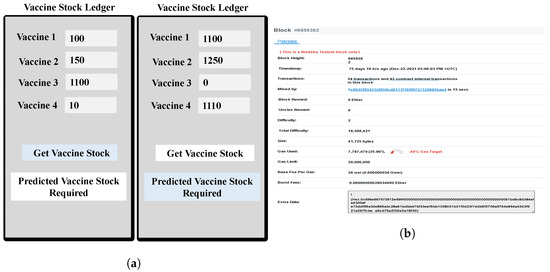 CoviBlock in run-time with transaction details. (a) CoviBlock automatically allots doses to different areas based on the last seven days’ consumption versus the total eligible population. (b) DDSS operation transaction details on test network.