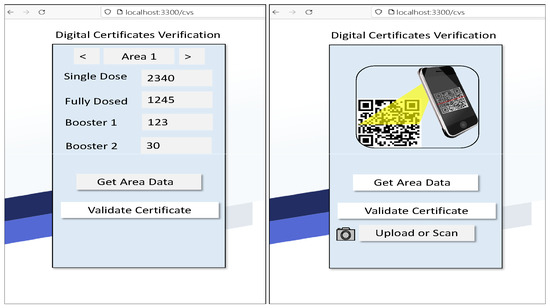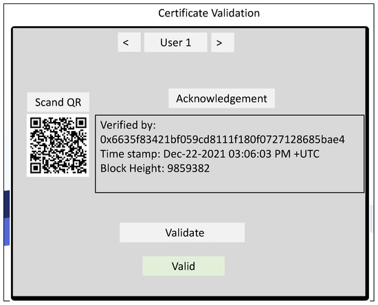 Using the suggested three-layer identity approach, the proposed system automates digital health certificate life-cycle operations such as enrolment, distribution, validation, and revocation. The digital health certificate manager function has two sub-functions: certificate life-cycle administration and validation. As depicted in Figure 9, the function generates a QR-code-based, tamper-resistant DHC certificate for each authorised user. Using DApp, anyone can demonstrate his/her identity and authenticity without disclosing personal information. To validate a user’s digital health certificate, a second user (the “validator”) must scan the QR code and initiate the validation process as shown in Figure 10. In addition, prevents the use of forged or duplicate certificates by implementing a public ledger system. With the aid of pseudo—Algorithm 5, an acknowledgment is generated for each successfully validated QR code.