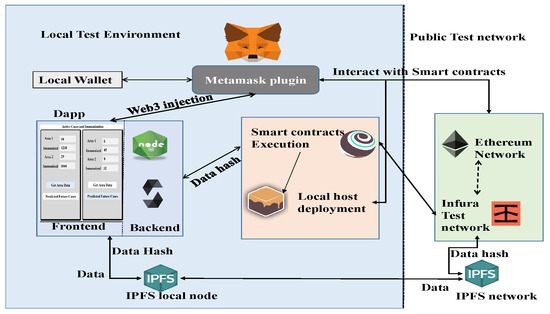 A CoviBlock prototype is simulated on four virtual computers (VC) connected via a virtual local area network (VLAN). Each VC includes a node.js-based decentralised application (DApp) for interacting with DDSS and DDRAC smart contracts. Figure 11 illustrates an overview of the DApp testbed. The RikBay testnet is used to validate and test the DApp smart contracts; the local setup consists of MetaMask, the Truffle framework, and Ganache; and the Infura platform is being considered for the public DDSS network. The web3.js API enables interaction between DApps and smart contracts on DDSS. The testbed VCs are equipped with 8 GB of RAM, an Intel i5 @2.30 GHz processor, and 150 GB of storage space. A network address translation (NAT) protocol is used to link the public DDSS network to the local infrastructure. In contrast, for the gateway use case, two mobile devices with 3 GB of RAM, an octa-core @2.0 GHz processor, and 16 GB of storage space are considered. In addition, we have published the experimental setup details in a github repository [28].