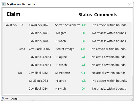 This section summarises CoviBlock’s DDSS communication protocol security validation using security protocol description language (.spdl) and the Scyther tool. The outcomes demonstrated that the protocol is resistant to data leakage attacks. Figure 12 demonstrates the outcomes of the Scyther tool analysis. The pseudo-code of the CoviBlock security protocol is presented in the next section, along with a tool that verifies whether or not sensitive data are disclosed. The and algorithms are used to detect man-in-the-middle and replay attacks, respectively. The parameters asserting confidentiality are the keys. To establish the DDSS protocol use case, a protocol is established between one leader () node and two IoMT devices ( and ). The symbols , , , and , for example, stand for the initial communication between nodes, the digital signature, mutually agreed-upon keys for one-to-one communication, and constant values, such as various identities, respectively.