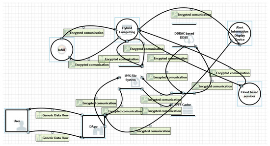 The Microsoft Threat Modeling Tool (MTMT) is utilised (Figure 13) to identify security threats at the system architecture level. Using the STRIDE (spoofing, tampering, repudiation, information disclosure, denial of service, and elevation of privilege) methodology, MTMT generates a list of potential threats. The MTMT tool highlights several known system attacks, such as cache and data spoofing, data tampering, actuator configuration tampering, repudiation, information disclosure at the storage level and transmission level, and escalation of actor privileges. Clearly, the DDSS and tamper-proof ledger protect the system from non-repudiation attacks. Following is a discussion of the theoretical security analysis of the proposed system.