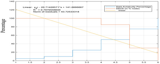DDoS vs. data availability. The proposed system availability increases when the number of participating nodes increases.