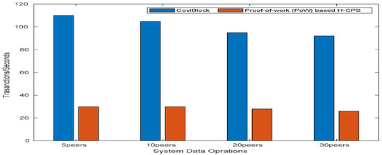 This subsection describes the scalability of Coviblock. Multiple tests were conducted by increasing the number of peers and concurrent transactions each time. The analysis of the results revealed that the proposed system was more scalable than blockchain-based H-CPSs. In addition, the proposed DDSS fabrication produced data operations with low latency when compared to PoW-based blockchain H-CPSs. The results are depicted in Figure 15. In its best case, the CoviBlock outperformed an H-CPS based on a bare blockchain nearly fourfold, and in its worst case, it was nearly threefold. Additionally, we present experimental analysis regarding group management in relation to the increase in participating nodes (Ls). CoviBlock manages low latency while initialising service groups and updating the group-level cache, as shown in Figure 16. CoviBlock requires more time during the initial stages of group creation due to device validation and crypto primitive generation.