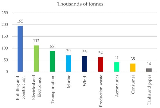 Estimated FRP waste in thousands of tonnes in 2025 (adapted from []).