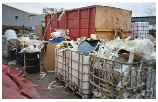 FRP production waste (scrap) produced in highly efficient automatic processes, such as pultrusion, is in the range of 2–5%. In comparison, it can increase to 15% when using manual methods such as a hand layup. CFRP pre-preg scrap in aerospace production can reach as much as 40% []. The average FRP manufacturing waste or process waste/scrap is estimated to be 10% of the production volume []. Most FRP production waste, as seen in Figure 3, ends up in a landfill. Dumping this waste in a landfill may not be the best sustainable waste disposal solution, as there are now strict laws in some European countries for landfilling. Moreover, the space available in landfill sites may be limited in some countries.