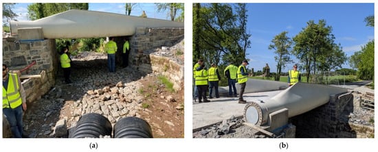 Re-Wind Network’s first footbridge in Cork, Ireland, constructed from decommissioned wind turbine blades in January 2022: (a) Front view of the blade bridge; (b) Side view of the footbridge, Photo Credit: Re-Wind Network [].