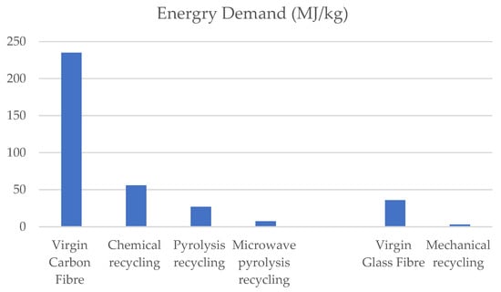 Recently, upcycling techniques have also been explored to extract better-quality carbon fibres than the original fibres. Upcycling means reusing the discarded material to create a product of higher quality or value than the original. Zhang et al. [] proposed an upcycling method for CFRP waste to minimise environmental pollution. Microwave irradiation pyrolysis was used under a nitrogen atmosphere in this method. The authors believe that microwave plasma pyrolysis using graphene porous materials is the best solution for CFRP upcycling from abandoned aircraft, wind turbine blades, and sports equipment. The reclaimed carbon fibre produced by the upcycling method had better properties than the virgin carbon fibre. The new method can also save energy and reduce carbon emissions.