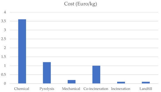 The incinerator operators usually charge more for accepting FRP waste, as it overloads the system due to toxic emissions and high calorific content. This means their capacity to process domestic waste is reduced. By accepting a small quantity of FRP waste for incineration, a large amount of domestic refuse must then be landfilled. The main business of the incinerator is to discard domestic refuse, not FRP waste []. Presently, incineration with energy recovery is considered a less cost-effective disposal method. The incineration of GFRP is not practical, as 50–70% of the material is mineral, which turns into ash after combustion and requires landfilling []. GFRP products usually contain 40% glass, 30% inorganic filler, and 30% resin. The glass and filler are mineral materials that do not burn. Together, glass and filler make up 70% of the composite part, which remains after incineration []. Incineration is also not suitable for large parts and glass fibre residue, as both can cause blockages in the process plant [].