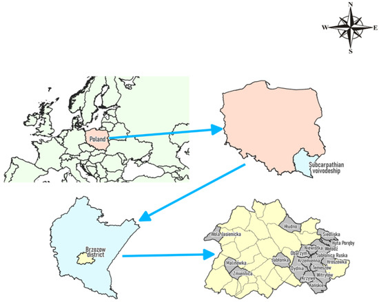 The study covered 18 out 44 villages situated within the administrative limits of the district of Brzozów in the Subcarpathian Voivodeship of southeastern Poland. This area was selected based on a previously calculated algorithm for delimiting rural areas according to soil classes into clusters with a similar surface area; the total share of arable land, meadows, and pastures; and the mean score [50]. The value of the last factor was calculated based on the scores assigned to the soil quality classes of arable land and grassland adopted from [56] and stemming from studies referring to four cereals and potato crop yields. The studies determined the production value of arable land and grassland according to soil quality classes on a 100-point scale.