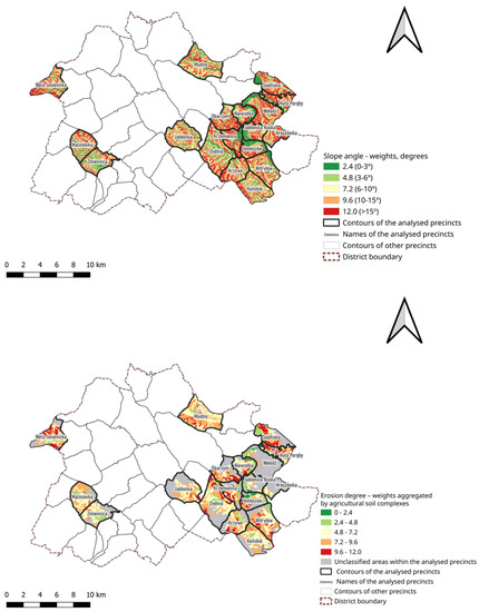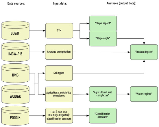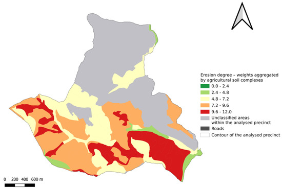 The above-described sources were also used to acquire information about soil types. This information, supplemented with general information about annual precipitation sums—calculated for the district area based on data from 2021 and provided by the Institute of Meteorology and Water Management—National Research Institute and predetermined slope angle characteristics—was used to determine the degree of erosion within the study site. Due to the fact that the characteristics are dependent on multiple factors, the calculations were divided into two stages. In the first stage, aggregated data on slope angle were assigned to delimited polygons that differentiated the study area in terms of soil type. The next stage classified the resulting unit polygons according to the corresponding degrees of erosion, taking into account the mean annual sum of precipitation within the study site.