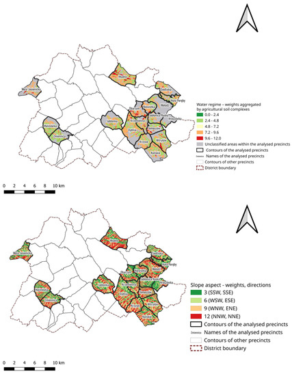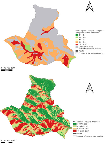 The features of these respective factors were thoughtfully selected based on: legislation—soil quality classes; guidelines provided by the Institute of Soil Science and Plant Cultivation (IUNG) in Puławy—the agricultural production space valorisation index (WWRPP) and agricultural soil complexes; the data resources of the Head Office of Geodesy and Cartography in Warsaw—the Digital Terrain Model (DTM) and slope angle; data from the Institute of Meteorology and Water Management in Warsaw—the risk of erosion and water regimes; and scientific knowledge and global rules—wind rose and cardinal directions (slope aspect). By contrast, the weights were assigned by us based on the multiple sources of information analysed and the acquired knowledge. The scores have an identical span since we believe they have an identical significance in such studies.