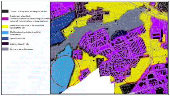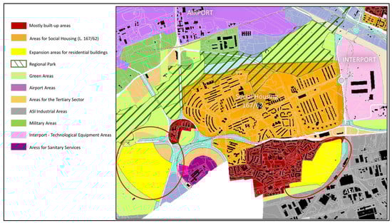 In the case of Bari, the municipality approved its DPRU in 2011 [29], as part of the DPP adopted in 2011. It identifies the San Paolo neighborhood as one of the target areas for urban regeneration, whose strategy should be aimed, on one side, to improve the quality of urban spaces and services as well as the railway connection to the city center and, on the other, to contrast soil consumption through a sort of greenbelt for agricultural activities with ecological and environmental functions linked to the Lama Balice park (see Figure 5). This is in striking contrast with the development provisions of the PRG.