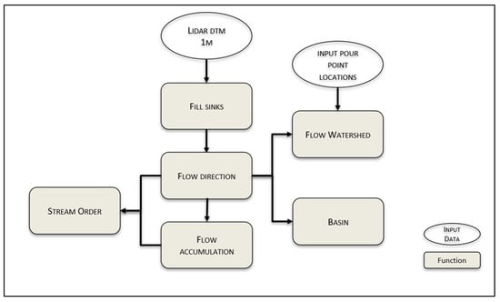 For the hydrological assessment of the study area, geographic information system (GIS) techniques have been used with the support of the ArcGIS 10.4.1 (Esri, Redlands, California, USA) software which provides a series of hydrological tools that have allowed, starting from the digital terrain model (DTM) mosaic on LiDAR data with a geometric resolution of 1 m, to build a series of thematic maps that have the same DTM as input. In particular, a series of elaborations of the study area have been developed using specific hydrological analysis functions of which the related input and output data are shown in the workflow model (Figure 3).