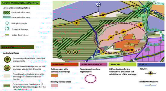 Structural-strategic scheme of the DPRU of the Bari municipality, San Paolo neighborhood (own elaboration with data from the DPRU and from the Map SSS.TC.1 of the DPP—Source: [26,29]).