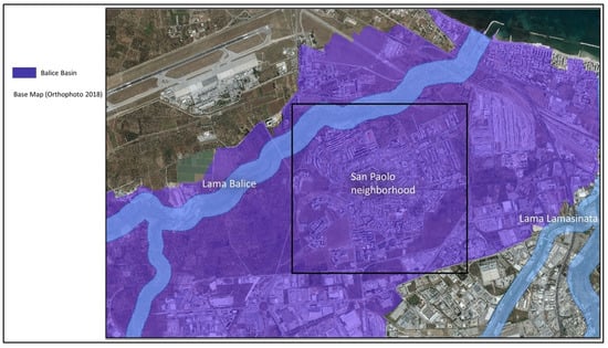 An initial analysis made it possible to highlight how the San Paolo developed within the “Lamasinata Creek” (Lama Lamasinata) basin, and lays between Lama Balice and Lama Lamasinata (Figure 6).