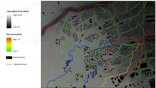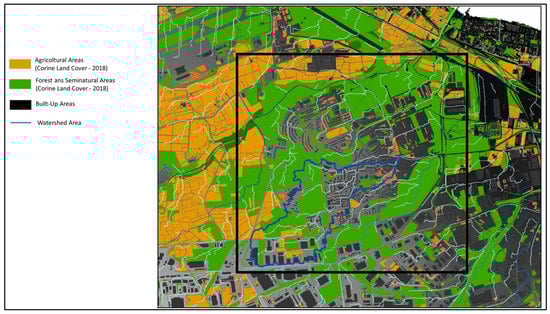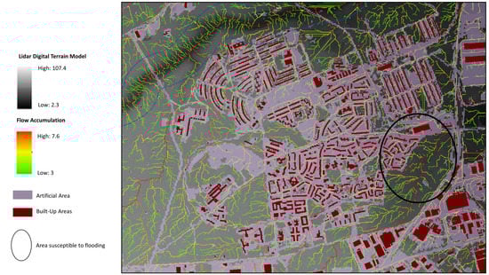 For this reason, in this paper, the estimate of the water flow accumulation areas has been carried on, to understand where the runoff originates and develops. This clarifies the water–soil interaction and, therefore, aids in understanding if and to what extent the use of the soil amplifies the runoff (see the impermeable areas) or attenuates it, as occurs in the green areas. Therefore, it is obvious that this is a milestone of the urban green plan and project and, in general, of sustainable urban planning.