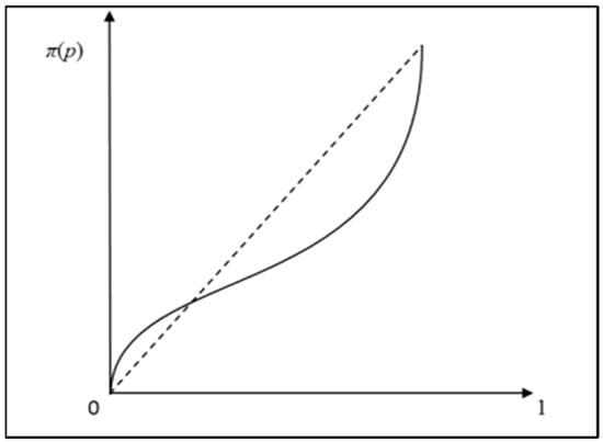 As can be seen from Figure 1, the shape of the curve of the value function presents an “S” type. The origin is the reference point. On the right side of the x-axis, the value function is the gain area, and the graph is concave; on the left side of the x-axis, the value function is the loss area, and the graph is convex. It is not difficult to establish that the slope of the curve in the gain area is smaller than that in the loss area, which means that the decision makers are more sensitive to the loss than the gain. In the same amount, the utility of the loss is greater than that of the gain. In short, decision makers are risk-pursuant in the loss area and risk-averse in the gain area.