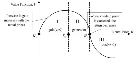 According to the introduction of prospect theory and value function in the previous section, the sensitivity to rental price is also different considering the different personality preferences and life perception levels of the owners. Therefore, the decision behavior of the rental price will be different. Its value function Equation (3) is as follows:
