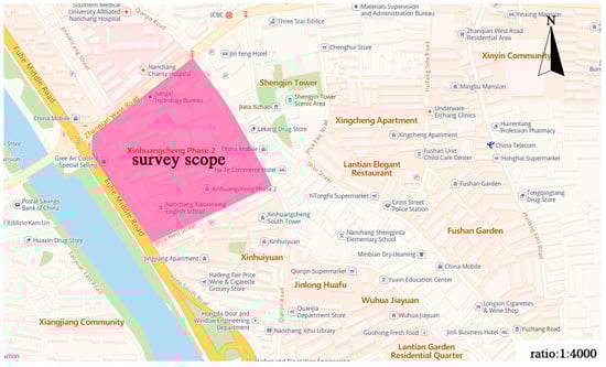 The survey method used a combination of SP and RP questionnaire. From 18 March to 24 March 2019, an RP and SP questionnaire survey was conducted in Xinhuangcheng District, Nanchang City, China (Figure 4). The community is located around the Shengjin Pagoda scenic spot, surrounded by a large number of residential areas. The daily traffic involves a large number of people and a large amount of traffic flow, and the parking problem is very serious.