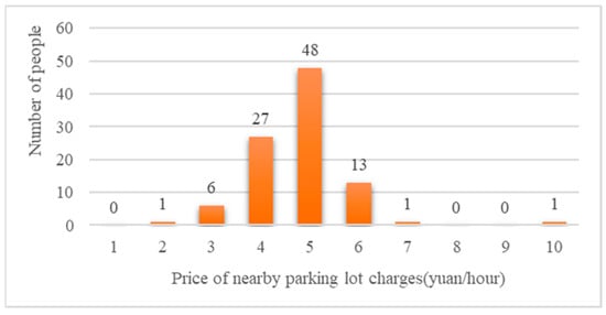 Figure 5 shows that nearly half of the respondents think that the price charged by the nearby parking lots in their own area is 5 CNY/h, which has the highest percentage. The charge price is mainly distributed between (4, 6), and the average value of this charge price is 4.77 CNY/h based on statistics. Since the charge price of 5 CNY/h accounts for the largest proportion, it is assumed that the charge price of the surrounding parking lot is 5 CNY/h in the scenario assumption of the questionnaire survey.