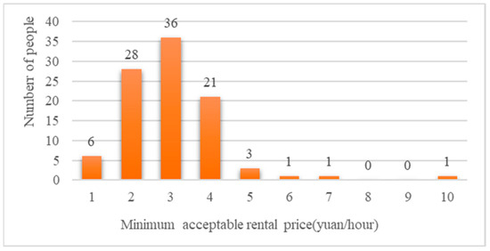 As shown in Figure 6, the minimum rental price that respondents could accept was mainly concentrated between (2, 4), with a percentage of 87.6%, with 3 CNY/h being the most. The average value of the minimum rental price accepted by the respondents was 3.01 CNY/h based on the statistics.