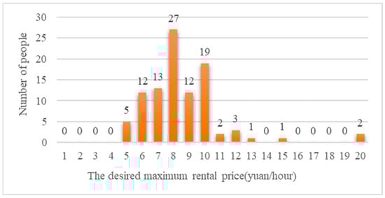 As shown in Figure 7, the maximum rental price desired by the respondents was mainly concentrated between (6, 10), with a percentage of 85.6%. The maximum percentage of 8 CNY/h was 27.83%. The maximum rental price was 20 CNY/h, while the minimum rental price was 5 CNY/h. The average value of the maximum price that parking space owners wanted to rent out was 8.53 CNY/h based on the statistics.