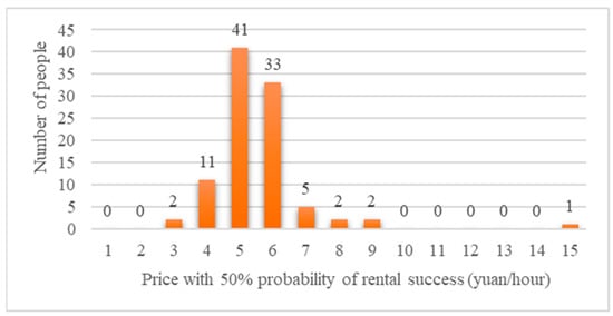 As shown in Figure 8, if there is a 50% probability that the parking space can be rented successfully, most respondents would choose to rent the private parking space at a price of 5 CNY/h, and the majority of respondents would rent it at a price of 4 to 6 CNY/h. Statistically calculated, if there is a 50% probability that the parking space can be rented out successfully, the average of the respondents’ desired rental price is 5.54 CNY/h. This indicates that in order to ensure a higher rental success rate, parking space owners are willing to lower their prices appropriately to gain revenue.