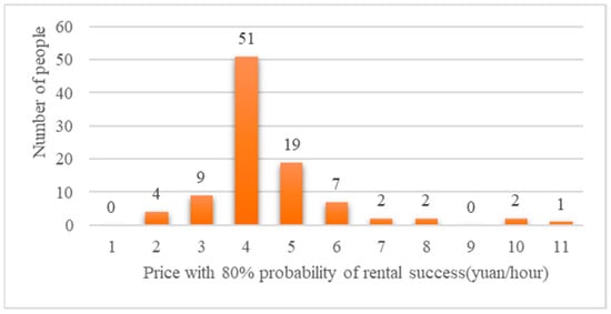 As shown in Figure 9, if there is an 80% probability that the parking space can be rented successfully, most respondents would choose to rent it at a price of 4 CNY/h, and the majority of respondents would rent it at a price of 3 to 6 CNY/h. Statistically calculated, if there is an 80% probability that the parking space can be rented out successfully, the average of the respondents’ desired rental price is 4.51 CNY/h. This indicates that in order to ensure a higher rental success rate, parking space owners are willing to lower their prices appropriately to gain revenue.