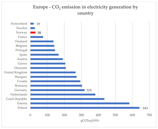 Norway is the second largest supplier of natural gas to the EU after Russia [3]. Given the geopolitical situation, the EU is seeking to increase pipeline and liquified natural gas (LNG) imports from Norway even further [5]. Additionally, Norway’s electricity production is not only amongst the cheapest in Europe [30,31,32], but also amongst the cleanest, nearly ten times lower than Germany [33] (Figure 2). Thus, Norway could use its abundant clean electricity to generate “clean” natural gas and send it to European countries through the existing pipeline network.