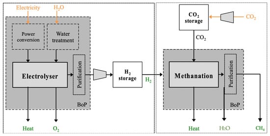 Leeuwen et al. [36] proposed a PtG system configuration (Figure 3) for the STORE&GO project. This study considers a similar setup composed of two principal systems, electrolyzer and methanation, further discussed in Section 3.3.