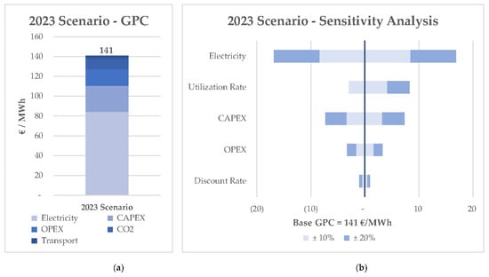 Results for 2023 Scenario: (a) GPC buildup; (b) sensitivity analysis for various parameters, the values on y-axis represent change in GPC in €/MWhSNG for a 10–20% change in parameter values.
