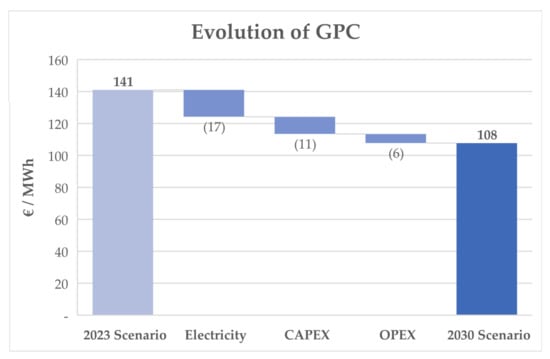 The result is aligned with previously conducted studies. Data from the pilot plants under STORE&GO project suggest that cost to produce SNG from the grid in 2030 will vary between 90–125 €/MWh depending on taxes, charges and network tariffs [65]. Bohm et al. [20] determined that large scale PtG plants will be able to reach production costs of 100 €/MWh by 2030 over a broad range of operating hours based on an optimized electricity purchasing strategy. Gorre et al. [23] estimate a GPC of 119 €/MWh for an average electricity price of 50 €/MWhel. Jiang et al. [28] estimate a GPC of 118 €/MWh for operations in Northwestern China.