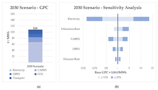 Results for 2030 Scenario: (a) GPC buildup; (b) sensitivity analysis for various parameters, the values on y-axis represent change in GPC in €/MWhSNG for a 10–20% change in parameter values.